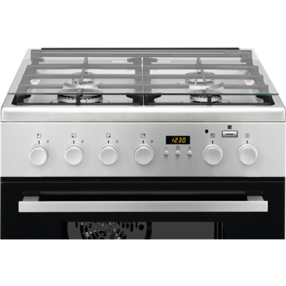 Плита Electrolux EKK96498CX цвета нержавеющей стали оснащена четырьмя газовыми конфорками и электрической духовкой. Автоматический электроподжиг позволяет разжечь горелку одним поворотом рычага, а газ-контроль гарантирует безопасность эксплуатации. Режимы с конвекцией и функция добавления пара PlusSteam позволяют готовить разнообразные блюда.