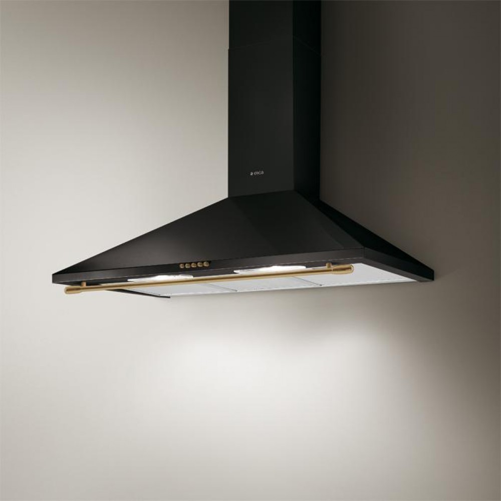 Кухонная вытяжка Elica TAMAYA RAIL ANBR/A/60. Эта вытяжка вызывает восхищение не только своими эксплуатационными характеристиками, но и впечатляющим дизайном. Антрацитовый купол украшает бронзовый рейлинг и того же оттенка кнопки, расположенные строго посередине. Рейлинг – не только декоративная деталь: к нему можно подвешивать разнообразные аксессуары для приготовления пищи, чтобы они были под рукой.
