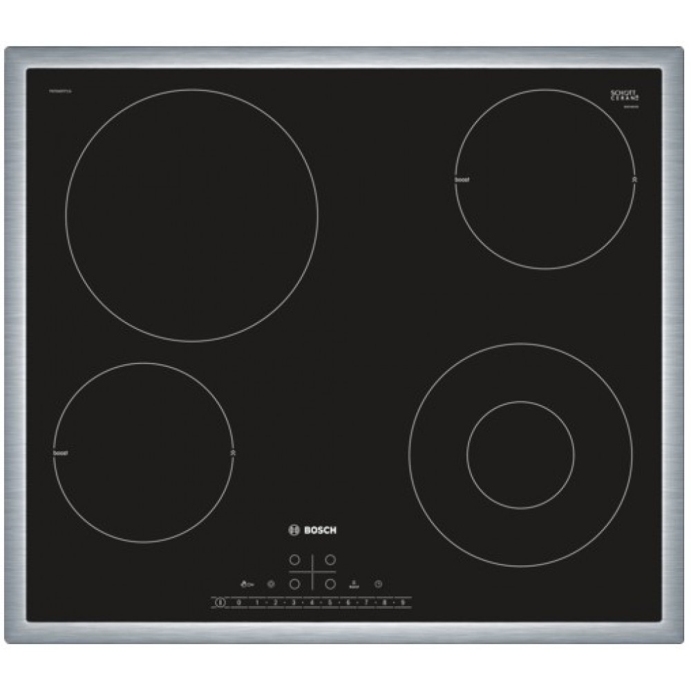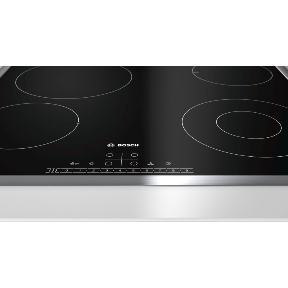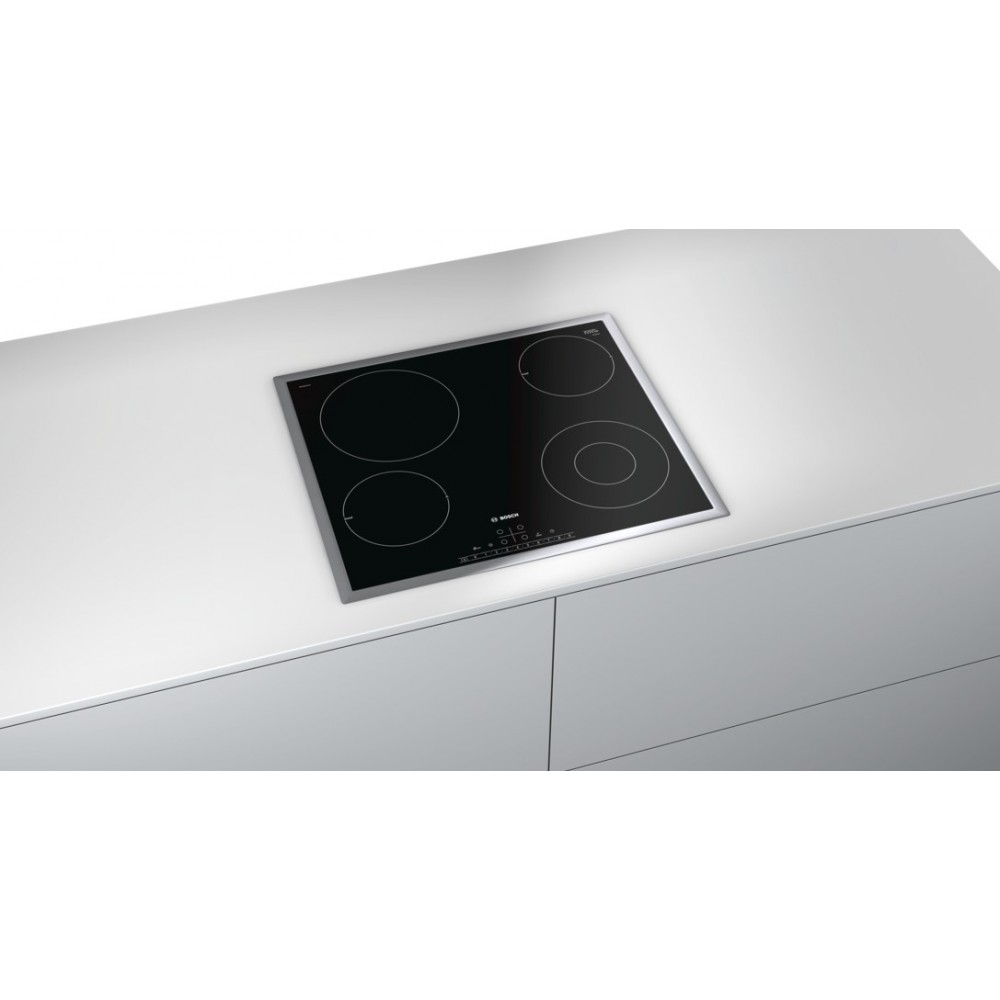 Чёрная стеклокерамическая поверхность Бош PKF645FP1G выглядит эффектно и современно, не боится перепадов температур и характеризуется высокой прочностью. Рамка из нержавеющей стали выполняет защитную функцию.