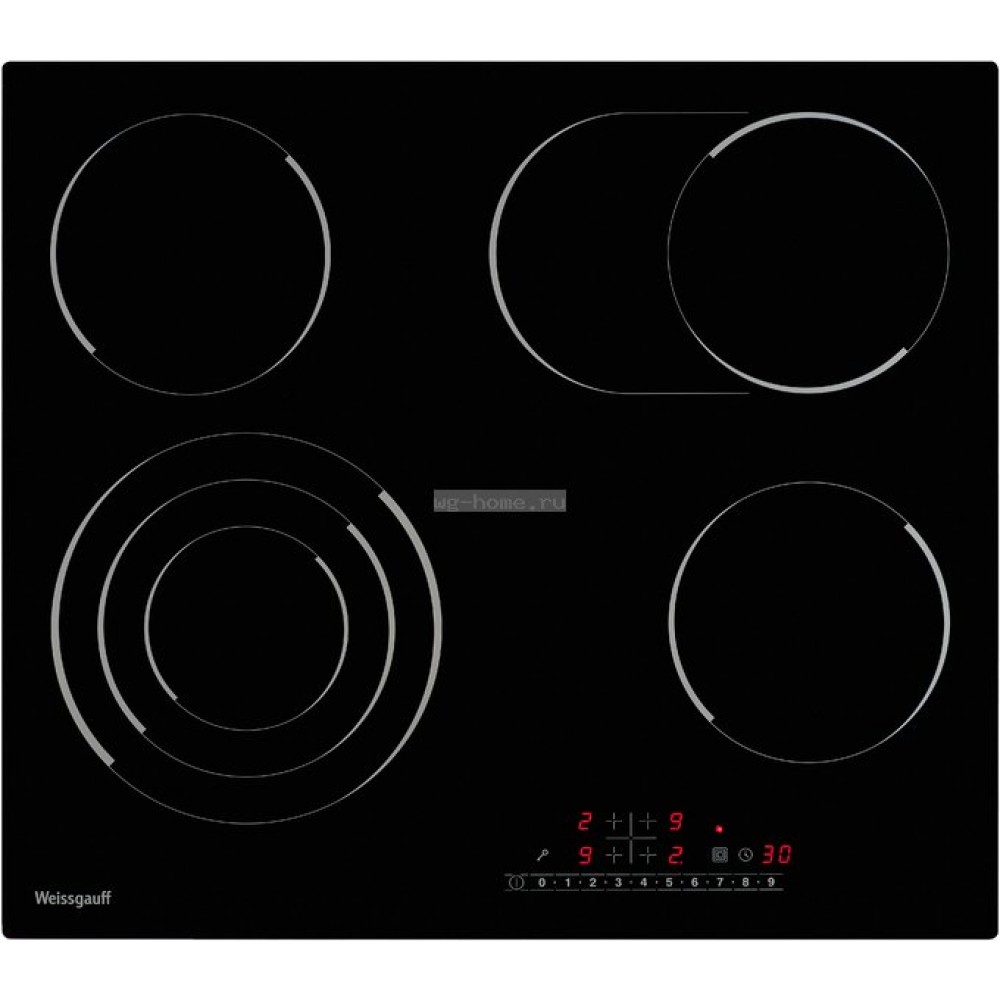 Электрическая варочная панель Weissgauff HV 643BS. Варочная поверхность Weissgauff HV 643 BS оснащена зонами нагрева high-light, две из которых обладают стандартной мощностью, одна имеет тройной контур и одна — возможность расширения до овала. Благодаря этому можно готовить в посуде с плоским дном любой формы. Безопасность прибора повышают функции защитного отключения и блокировки от детей.
