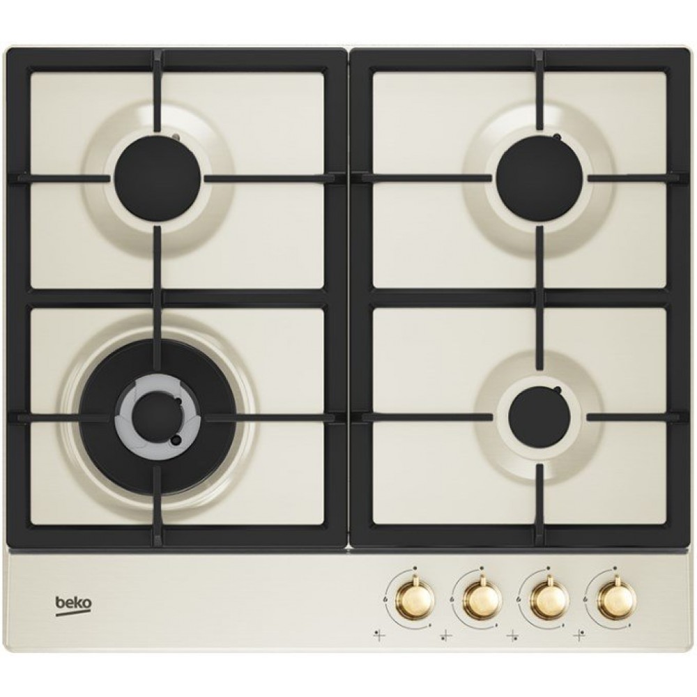 Газовая варочная панель BEKO HIAW64225SCR. Варочная панель Beko HIAW 64225 SCR бежевого цвета имеет поверхность из закаленного стекла. Мощная вок-конфорка расположена слева спереди, ее можно использовать для приготовления в большой посуде, жарки в сковороде с округлым дном или казане. Поджиг горелок осуществляется поворотом регулятора. Чугунные решетки надежно удерживают посуду, за ними легко ухаживать. Газ-контроль обеспечивает безопасность от утечки.