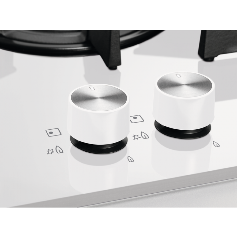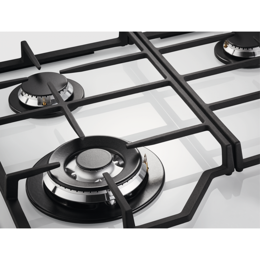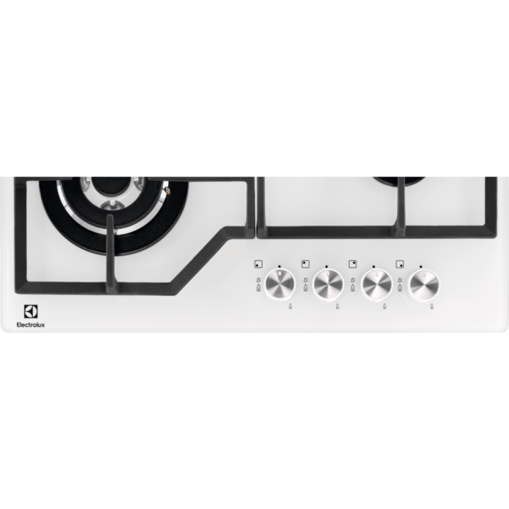 Варочная панель Electrolux GPE363YV белого цвета из коллекции «Газ на стекле» оборудовала мощной WOK- конфоркой 3.9 кВт, на ней можно готовить не только в посуде с округлым дном, но также и в обычных больших кастрюлях и сковородах. За гладкой поверхностью и чугунными решетками легко ухаживать. Система газ-контроль защищает от утечек.