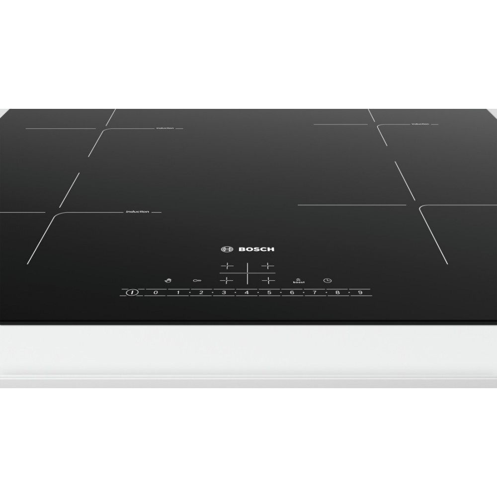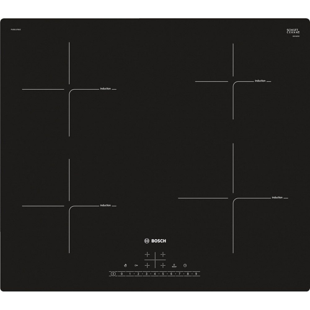 Управление осуществляется сенсорными кнопками, центр четырех зон нагрева (конфорок) обозначен крестообразной разметкой. Блокировка от детей — присутствует, индикатор остаточного нагрева предусмотрен для каждой конфорки.