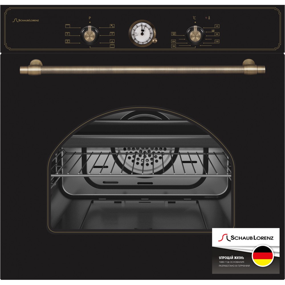 Электрический духовой шкаф Schaub Lorenz SLB EZ6861 относится к линии Vintage. Черный цвет, бронзовая фурнитура и дизайн элементов управления выгодно выделяют технику из всей линейки духовок компании SchaubLorenz.