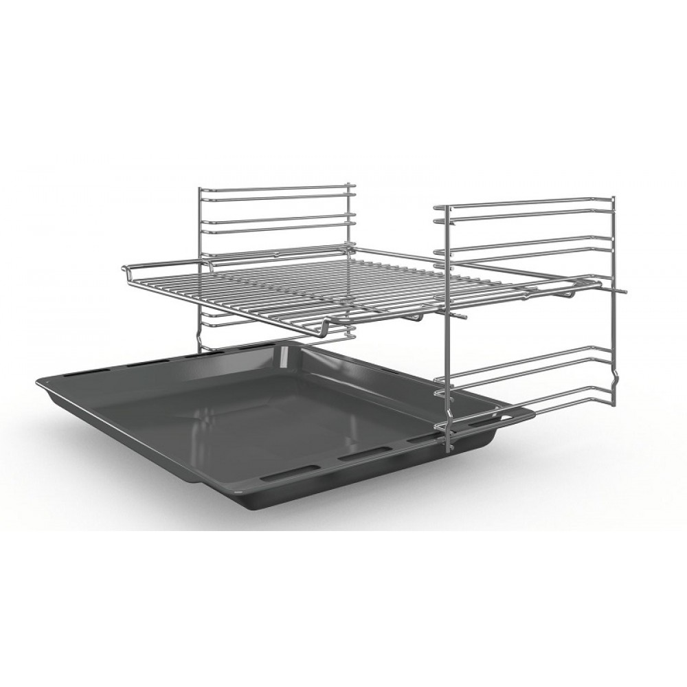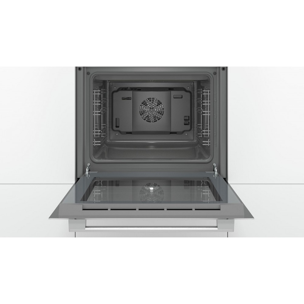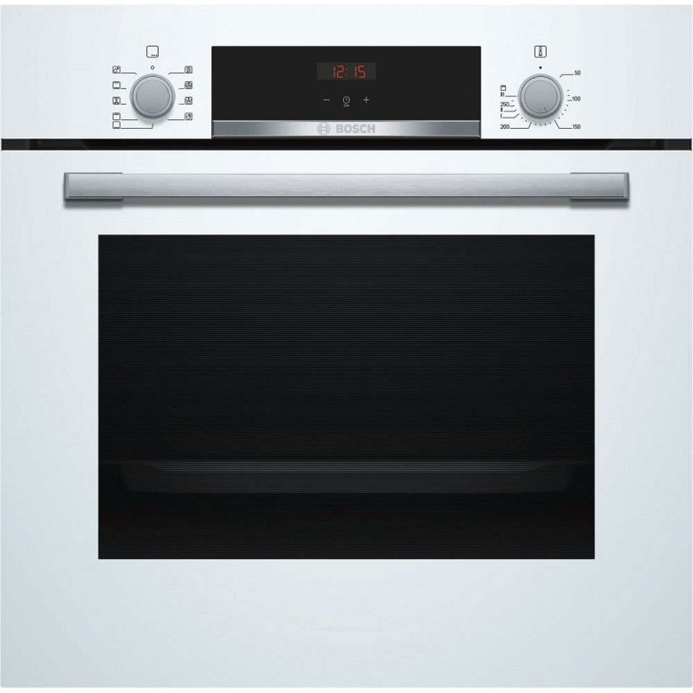 Электрический духовой шкаф BOSCH HBF514BW0R. Духовой шкаф Bosch HBF514BW0R из линейки Serie | 4 оснащен 8 режимами нагрева, включая конвекцию, гриль, разморозку и программу для приготовления пиццы. Управление моделью осуществляется при помощи утапливаемых повторных переключателей, с помощью которых выбирается температура и функция, многофункциональные часы EasyClock настраиваются при помощи сенсорных кнопок. У модели предусмотрена система охлаждения, а также присутствует тройное тройное стекло на дверце, благодаря чему температура фронта не превышает 50 C°.