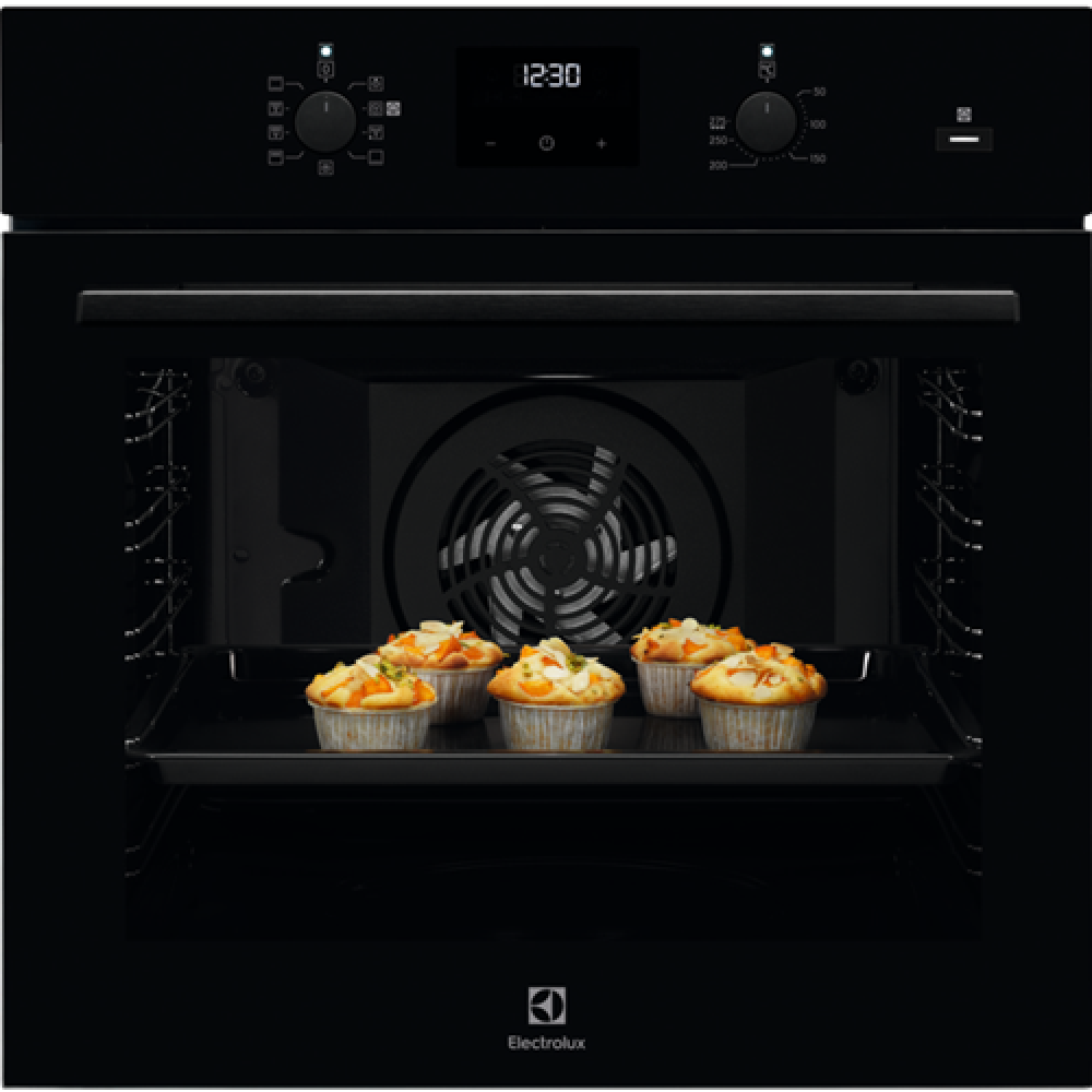 Электрический духовой шкаф Electrolux OED3H50TK. Electrolux OED 3H50 TK — встраиваемый духовой шкаф в черном цвете. Прибор обеспечит равномерное приготовление самых разных блюд. Утапливаемые переключатели способствуют комфортному управлению устройством, вся необходимая информация отображается на светодиодном дисплее. Эмаль легкой очистки покрывает стенки камеры духового шкафа. Жир, попадающий на ее поверхность, расщепляется на углекислый газ и воду, тем самым упрощая процесс обслуживания.
